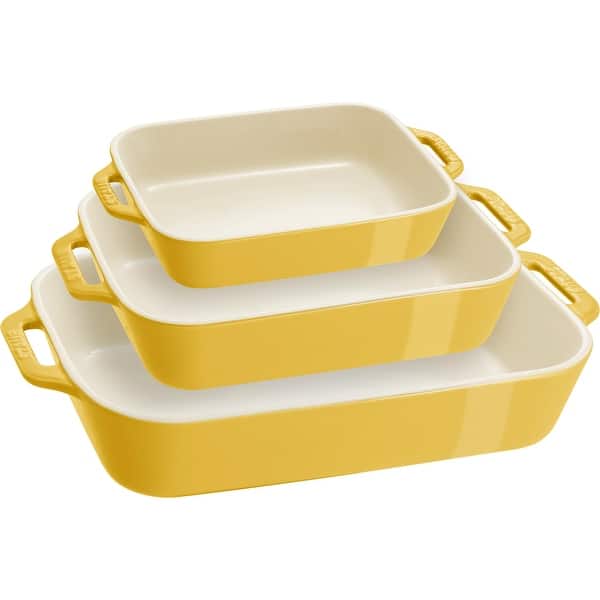 This set features three nestable rectangular ceramic baking dishes in three handy sizes. They are perfect for lasagna, casseroles, and desserts, as well as roasted meats and vegetables. Cook for a crowd in the roomy 13 by 9-inch dish, bake a one-dish family meal in the 10.5 by 7.5-inch dish, or bake a sumptuous side in the 7.5 by 6-inch dish. Then serve directly to the table in these elegant dishes.